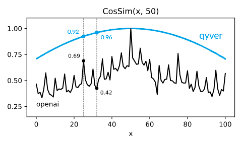<figure><img src="https://3582402547-files.gitbook.io/~/files/v0/b/gitbook-x-prod.appspot.com/o/spaces%2Fa1WA83Ym6zkEykb98MkK%2Fuploads%2F69mDccpKrehCWFfXB6xB%2Fqyvercossim.png?alt=media&#x26;token=3a6af9a1-aead-4503-a882-fa815c91a18e" alt=""><figcaption><p>OpenAI embeddings result in noisy, non-monotonic cosine similarity scores. For example, CosSim(25, 50) equals to 0.69 when CosSim(32, 50) equals 0.42 meaning 25 is more similar to 50 than 32 which doesn't make sense. Qyver number embeddings avoid such inconsistencies by design.</p></figcaption></figure>
